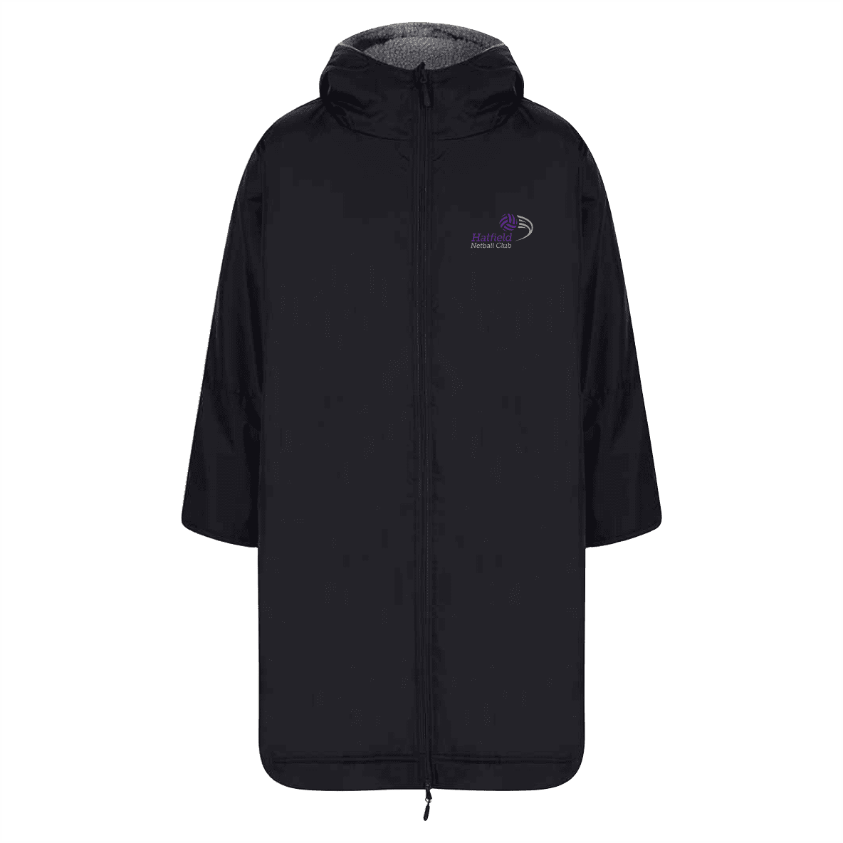 Water-resistant robe with sherpa fleece lining and a three-piece hood. Full double-ended zip down centre front. Zipped pockets with fleece lining. Inner zipped pocket with water-resistant lining.